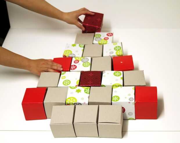Organizar las casillas a cualquier configuración que usted desee. Se trata de ser creativo. Para este proyecto hemos elegido la forma de un árbol de Navidad.