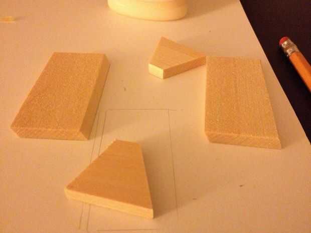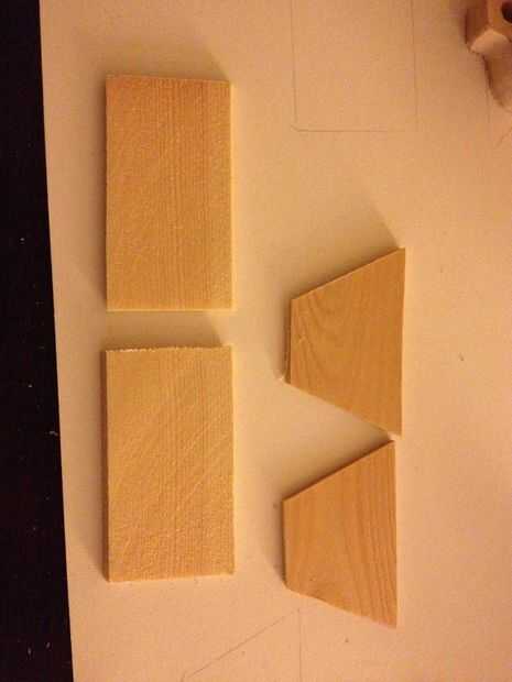 Para el primer diseño, he creado una plantilla como en la imagen. Hice dos de estos coches. I cortar dos paneles laterales en el triángulo de int de ángulos de 30 grados y luego corte la punta de cada triángulo. Estas son las conteras. Luego cortar las paredes laterales y poner una inclinación de 30 grados en la parte superior e inferior de cada pieza de la pared para que se alinean con los extremos uniformemente.