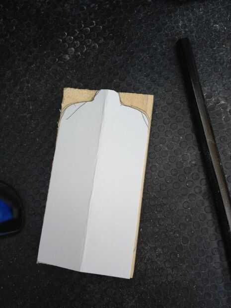 Una vez corte 21 pulgadas 4 secciones, sección 2 de 6 pulgadas y 1 sección de 5 pulgadas, cortar una plantilla de papel para marcar los extremos de los bloques para las secciones de conexión del coche. Usé la plantilla en ambos extremos de cada bloque (excepto la parte delantera del bloque motor).