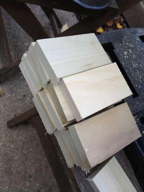 Una vez que muelen lo suficiente de mi madera en espesores adecuados, corté las tiras de 1/2" en las piezas de cuerpo para los coches. Estas son las piezas más gruesas como lo planeado perforar para las ruedas. Que no sea el cuerpo de la locomotora y los coches de madera, los bloques eran de 4 pulgadas de largo. El bloque del motor es 5 pulgadas de largo, y los dos coches de madera eran 6 pulgadas de largo.