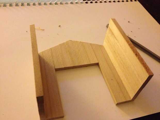 Para la cara me pegan pedazos y luego recortar la parte inferior a ras con el lado. Traje los tablones juntos en un ángulo de 30 grados en el centro como se puede ver en la imagen.