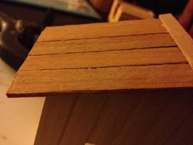 Para el techo, tomó del resistida mirando exceso de madera de las planchas del techo proceso y fabricado fresadora. Corte cada uno para adaptarse y pegados a lo largo de la cara y las paredes.