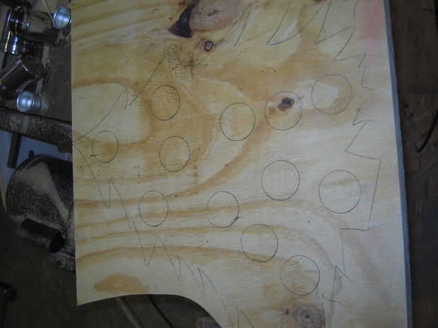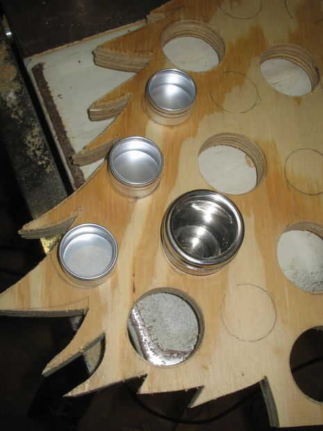 Básicamente sólo jugaba con los diferentes envases hasta que encontré algo que se veía bien y era más o menos triangular. Luego dibujé el árbol alrededor de él. Una vez todo parecía bien, remonta alrededor de los grandes botes así que sabía dónde perforar los agujeros.