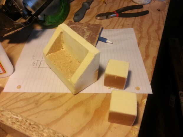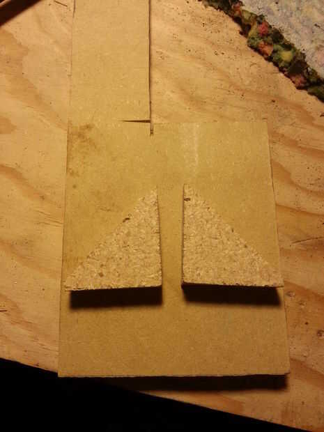 Las piezas laterales son esencialmente simples pero son una forma un poco más compleja porque siento el borde en un ángulo se ve mejor que una esquina aguda. La forma más sencilla de lograr esto es medir y cortar una pieza que coincida con las dimensiones indicadas en el paso anterior. Cortan ese pedazo de esquina a esquina dejando dos triángulos, uno para cada lado.