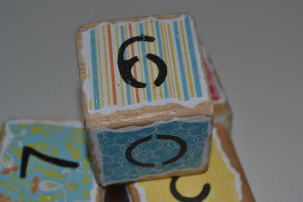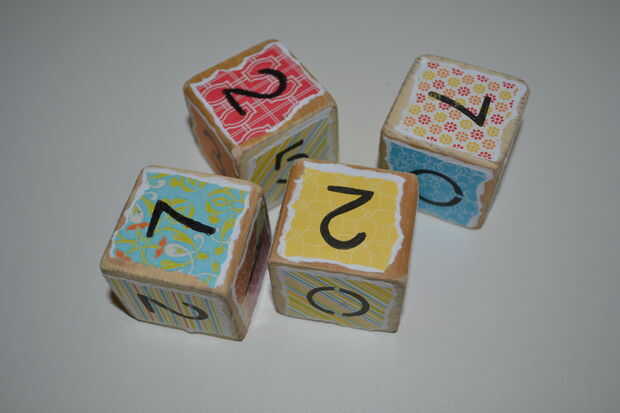 Mi esposa decorado los bloques #1 rompiendo sus cuadrados de papel decorativo, pegado a cada cara y después usando una plantilla a la tinta en los números. Poner un esmalte claro sobre los bloques cuando están hechos les ayudará a durar más tiempo. Para los bloques #2 señala simplemente los números con un marcador permanente.