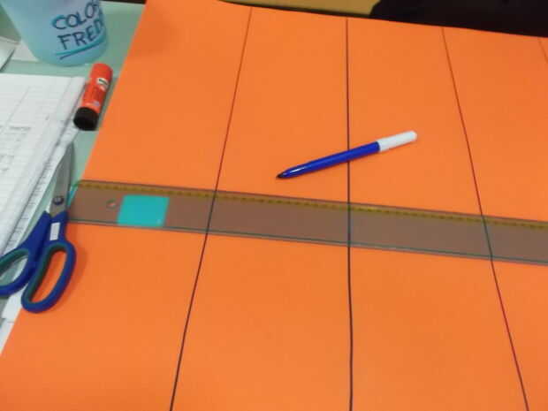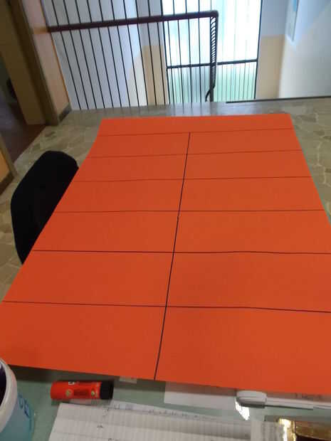 Con la punta de fieltro y la regla, divida el cartón más grande de 12 espacios. En este caso quería hacer una casa, pasen, por lo que divide el rectángulo en 2 columnas y 6 filas.