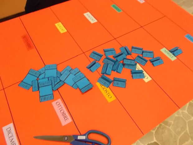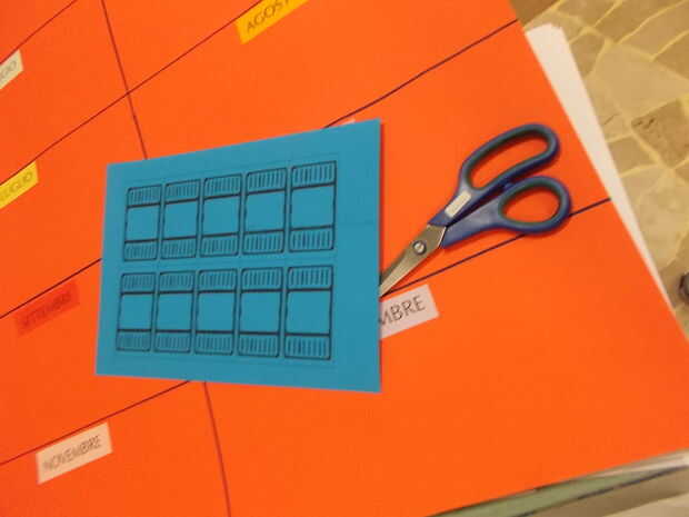 Dentro de las ventanas, bajo la persiana doblada, escriba el nombre de los alumnos y fuera el día de su cumpleaños. Cada ventana será el cumpleaños de un alumno.