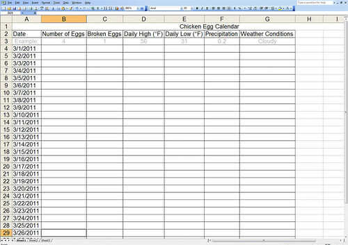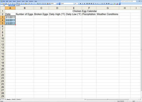 Consejo: En lugar de escribir en el día para cada célula individual, sólo tienes que escribir las tres primeras fechas en las tres primeras células que desea, entonces resaltar esos tres días, y luego en la esquina inferior derecha de la celda, si mantiene el cursor sobre él, usted verá una cruz negra sólida. Mantenga pulsado el ratón y arrastre todo el camino hasta donde quieras el intervalo de fechas para parar. "Auto llenado" en los días para usted. Para mí, se detendrá al final de cada mes.