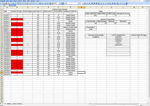 Ya he comenzado seguimiento abril, pero no soy de seguimiento el peso promedio de cartón ya. No parece haber un patrón específico, pero generalmente nunca obtenemos 6 huevos (solo 3 veces en marzo), parcialmente debido a una gallina que tenía bronquitis infecciosa (al menos eso es lo que pensamos) pero no sabemos con certeza.