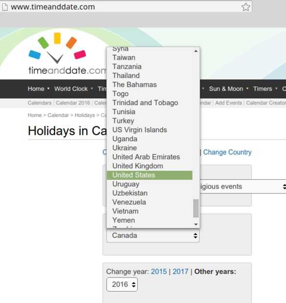 Hojas de cálculo de vacaciones Estados Unidos de timeanddate (enlace más abajo) para 2016 w/Autofiltro