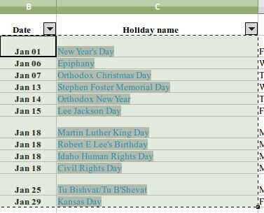 arrastrar a través y hacia abajo para seleccionar todas las vacaciones