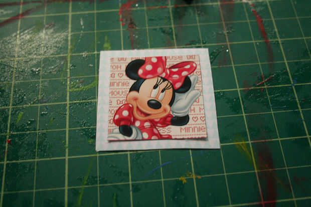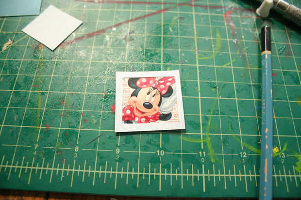 Cortar una imagen de una contraportada calendario, corte para caber dentro de un cuadrado de brillo y pegar al centro. A continuación, pegar el marco en la parte superior. Déjelo secar.