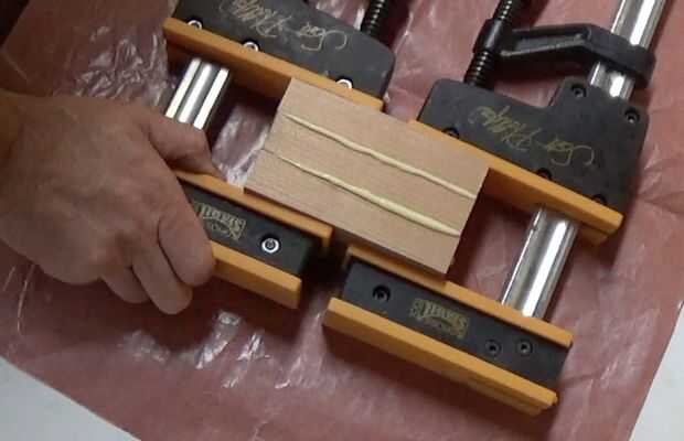 No tengo 2" espesor stock, así que tuve que pegar tres piezas para darme un espacio en blanco que era lo suficientemente grande para proporcionar dos cubos de 2". Pegué 3 piezas que eran cada uno de aproximadamente 5" de largo, por 2-1/2" ancho.