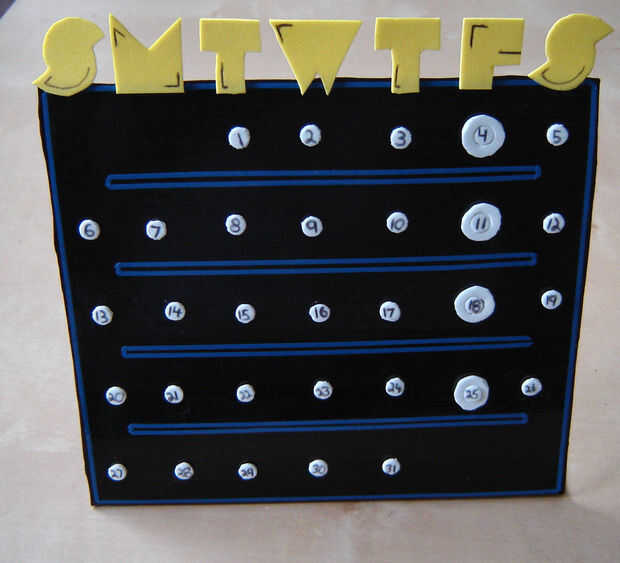 Una vez que el pegamento ha secado, coloque los puntos de la fecha en el calendario según el mes presente y Pacman en fecha de hoy. Utilice el fantasma y la fruta para marcar ocasiones especiales o para usar como recordatorios de eventos. Almacenar caracteres adicionales y puntos que han sido eliminados por colocar en la parte trasera del calendario para su custodia.