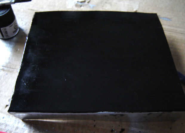 apliqué una imprimación metal primero en el metal de hoja antes de pintar con una pintura de acrílico negro brillante.  Agregar una capa de barniz una vez que ha secado la pintura es una buena idea ya que los imanes en movimiento en el calendario probablemente sería rayar la pintura con el tiempo.