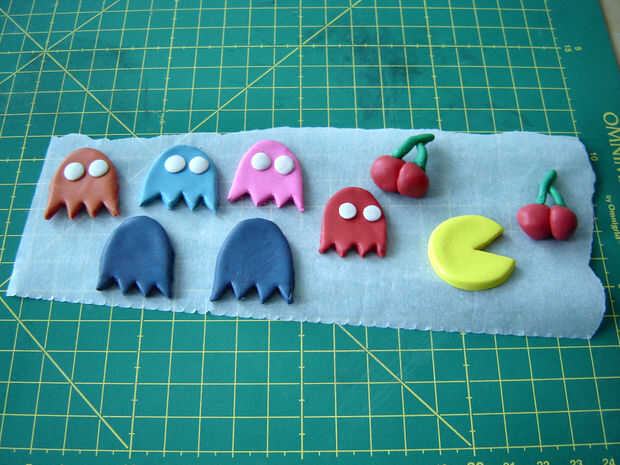 Para hacer los fantasmas similares formé un cortador de galletas de una lata de candelita.  Hay rojo de cuatro fantasmas (Blinky), rosa (Pinky), azul (Inky) y naranja (Clyde) además del espíritu transformado que son de un color azul oscuro (acabo de hacer dos de estos).
