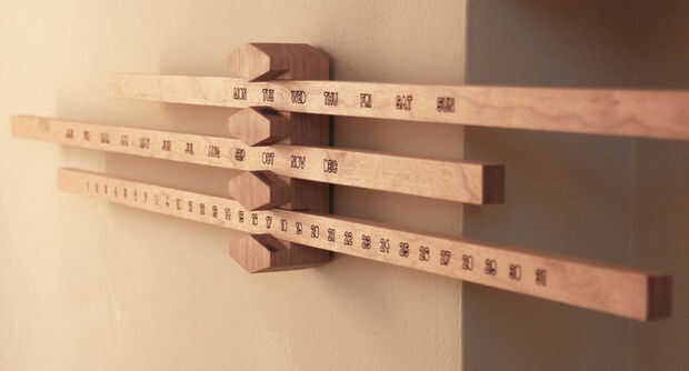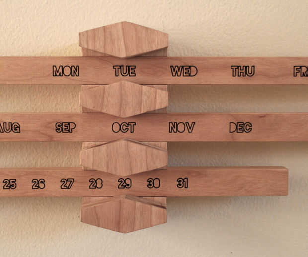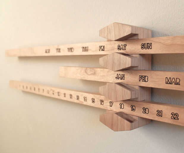 Mi hijo vino a mí con una foto que encontró en línea de un calendario de escritorio hecho de bloques de madera. Era originalmente de pinterest o algún sitio similar. Tomé que idea, había retocado el diseño y construyó esta de madera maciza de cerezo.