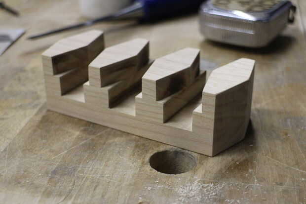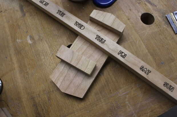 La base tiene 3 capas: la pieza base, los espaciadores (mismo espesor que los palos con el texto) y las piezas de chevron superior que el texto en el centro.