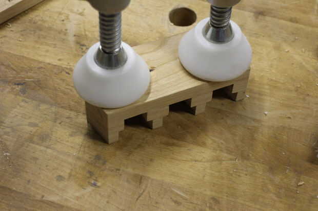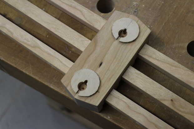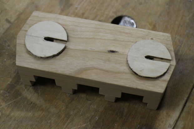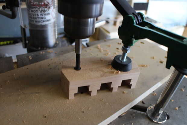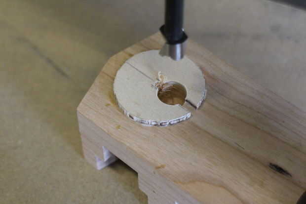 A continuación, taladré orificios con brocas forstner para hacer las cavidades para los tornillos. Después de pegar los discos en, perforé otro agujero debajo de la parte superior de las ranuras de los discos para permitir que los tornillos entrar en el ojo de la cerradura.