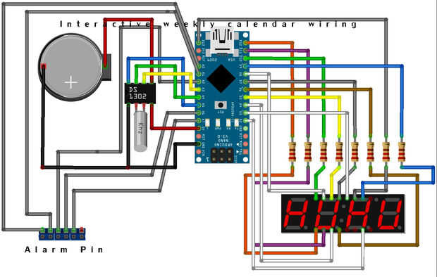 Seguir el cableado cuadro y hay .ino archivo adjunto para cargar el programa en el micro controlador (Arduino nano), utilizamos timeAlarm biblioteca de funcionamiento alarma diaria y sólo mostrará la fecha y mes.