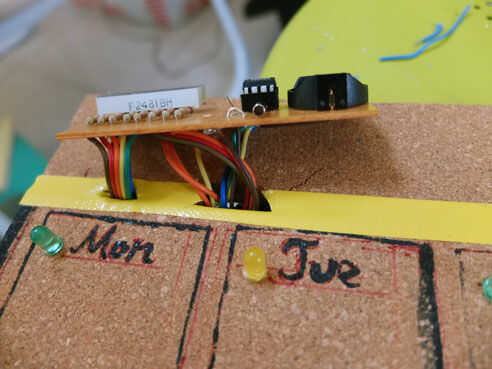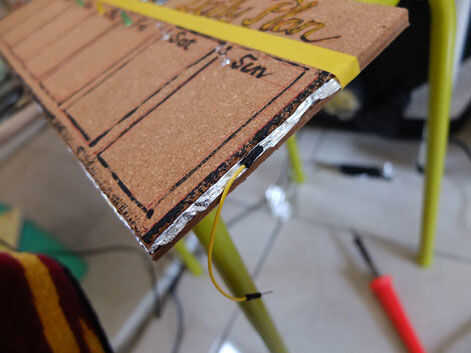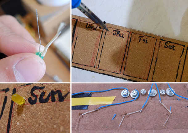 Hacer un agujero cerca de texto "día" por soldadura para poner el led interior tablero del corcho, envuelva el pie positivo de led con cinta de papel para evitar la tensión de cortocircuito.