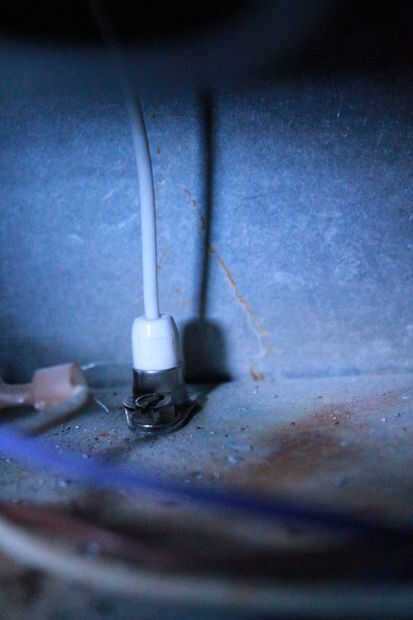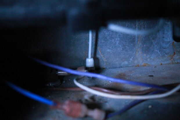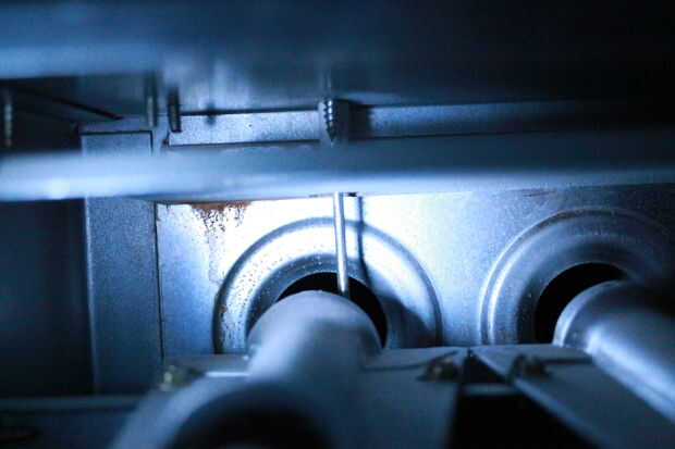 Sensor de la llama se cuelgan debajo del estante múltiple y frente a un quemador.