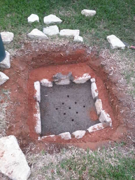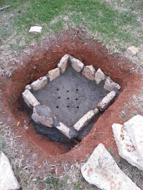 Cuando termine de hacer la primera capa de piedras, poner algunos re bares en el centro y verter el cemento para crear la tierra, de plano hacia fuera.
