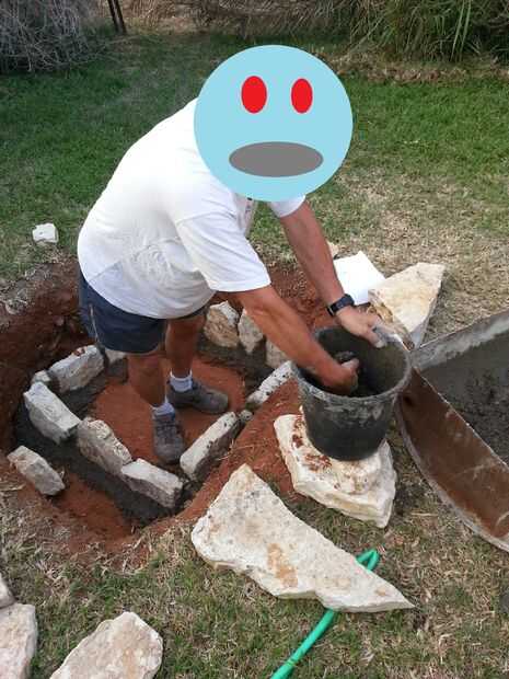 Empezar haciendo la primera capa de piedras. Verter algunos de hormigón bajo las piedras y entre ellos.