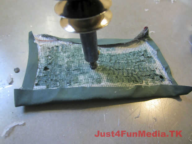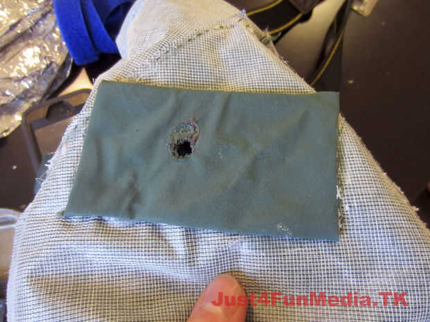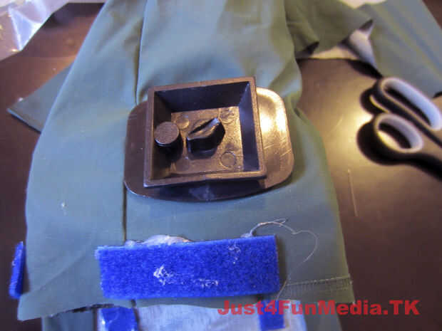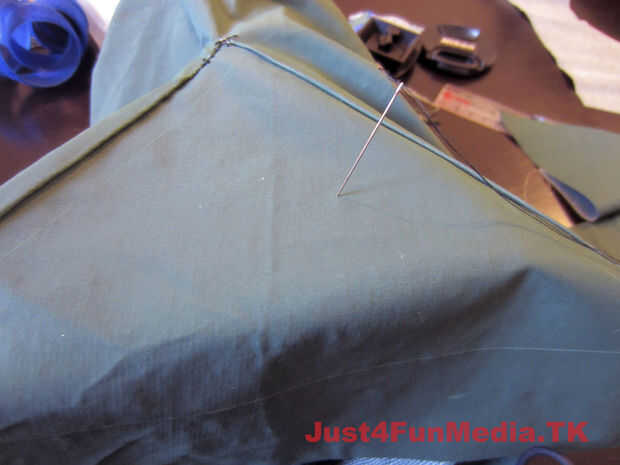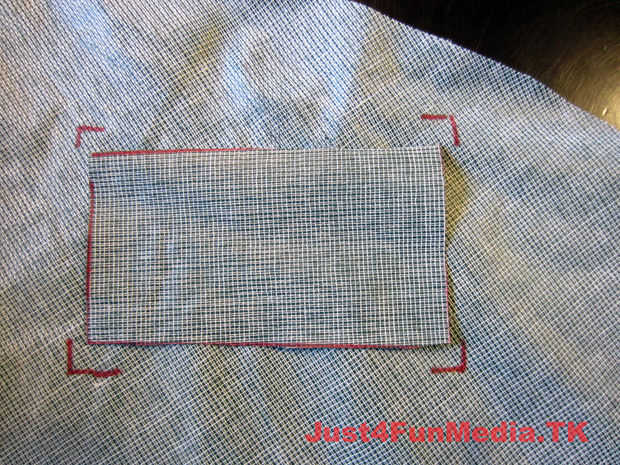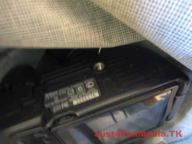 Primero marca la posición de trípode de su cámara cuando se coloca perfectamente en el caso (con la lente más grande). Porque poliester reforzado tela PVC es propenso a desgarro me aseguré de reforzar el área que rodea el agujero para el tornillo del trípode con varias capas de tela. Entonces fundió todas las capas usando el soldador contundente antes de fundirse en un agujero en la caja para el tornillo del trípode.
