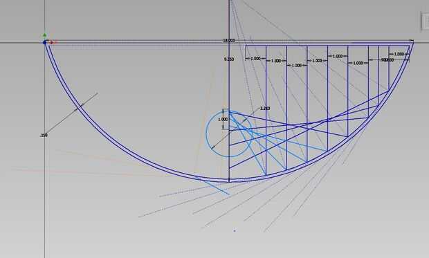 Pensé que sería la forma más fácil de hacer (aproximadamente) una parábola restringir los bordes de una lámina de plástico entre dos lados de un marco de caja de madera y deje que se doble hacia abajo a través del marco. El plástico actúa un resorte y se sostiene firmemente contra los bordes de la madera. Para obtener un buen punto de partida para qué longitud hacer la pieza de plástico aproximó la desviación de la plástica como un arco constante entre la 18" y ray hizo traza líneas en un esbozo de Autodesk Inventor.