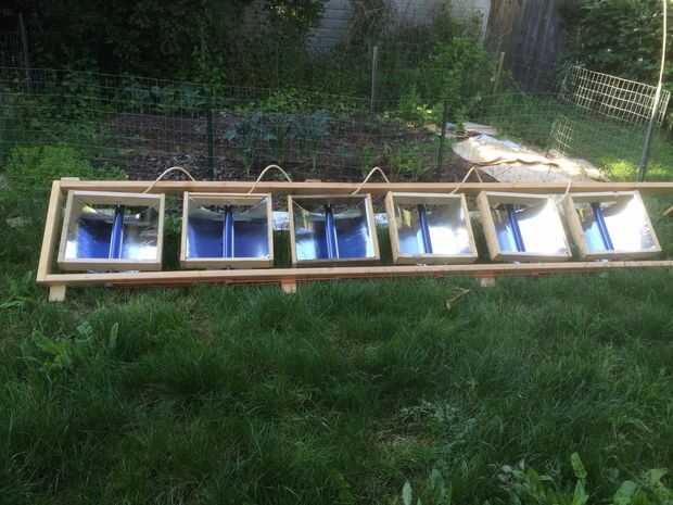 No he pude hacerte con un calentador de agua de repuesto o un tanque aislado, así que mis pruebas ha llevado a cabo usando sólo el volumen de los colectores y tubos (poco menos de 2 galones). En un día soleado pude poner agua a hervir ajustándolo manualmente aquí y allá. Debería funcionar muy bien para la destilación de etanol, especialmente una vez que lo tengo de seguimiento automáticamente.