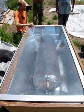 Creo que este es un diseño muy simple que mayoría de las personas es capaces de hacer con herramientas muy básicas, barato y sin conocimientos avanzados de carpintería. es un efectivo calentador - he visto el agua en 150F de superior alcance en un día caliente del resorte.