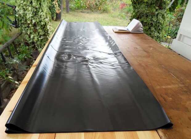 -2 x 2 m de forro de estanque de PVC de 0,5 mm negro. 0,5 mm es suficiente y por supuesto debe ser negro! Que debe costar algo alrededor de 8-12 euros.