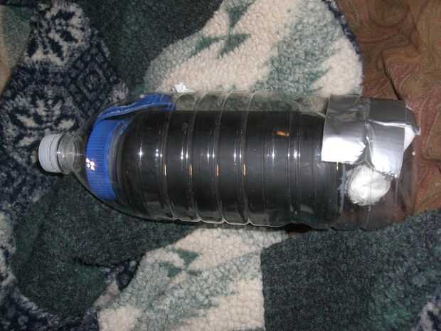 La foto muestra la botella exterior alternativa - una botella de refresco de PET de 1 litro con la parte inferior corta aproximadamente 2 pulgadas desde la parte inferior y atado en un lado con cinta adhesiva. Esto le permite a la parte inferior para cargar la botella de polietileno de alta densidad pintado en negro de la bisagra.