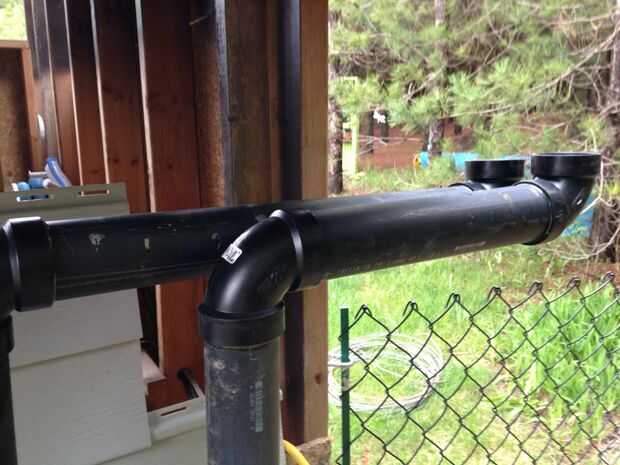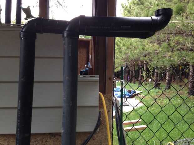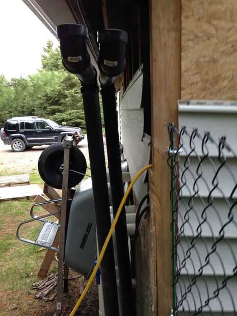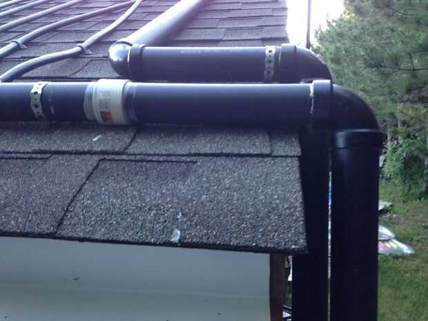 Uso cemento de transición para conectar el ABS a los codos de PVC extendiéndolas hasta aproximadamente 4-6" por debajo de la línea del tejado. Añade codos de 90 grados y ejecuta los tubos a aproximadamente 4-6" más allá del borde del techo. En mis fotos corro las tuberías al lado de la azotea es un eavestrough en el borde inferior del techo. Agregue más codos y piezas rectas hasta que las tuberías están en el techo listo para la instalación de calefacción solar.