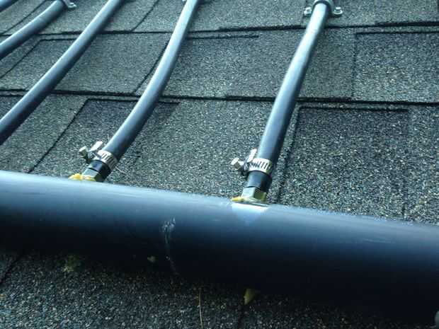 Esta parte se puede escalar hacia arriba o hacia abajo para adaptarse a sus necesidades. Puede utilizar en cualquier lugar de 8 a 16 piezas de 1/2 pulgada polypipe para crear la Asamblea de la calefacción. Mínimo de 8 piezas para permitir el flujo del agua va desde 2" a 1/2" tubos. La cosa de importar para recordar cuando diseño el sistema es que el flujo de agua hasta el techo. Si intentas ir hacia los lados a lo largo de la azotea entonces llenará las líneas de fondo y los superiores no tendrá agua que fluye a través de ellos a gravedad y presión. Haciendo fluir hacia arriba todos igualmente llenará y flujo en la misma proporción a la parte superior del sistema. Luego de la descarga en un tubo de colección de 2" y se llevó de nuevo hasta el sistema de piscina.