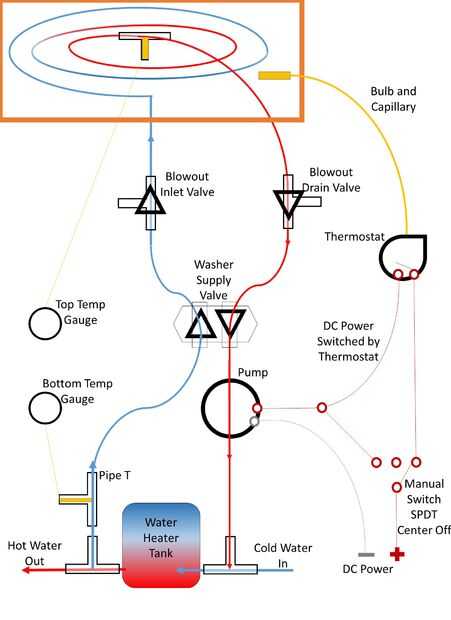 - Flexión de conductores de la línea de la bomba a una "T" instalada en el lado de la "entrada de agua fría" del calentador de agua.