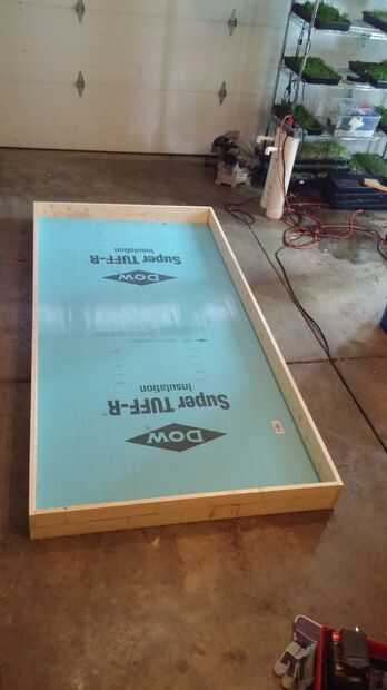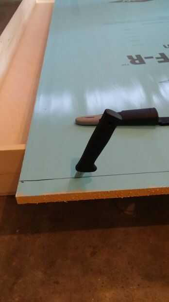 A fin de minimizar la transferencia de calor no deseadas entre la unidad térmica solar y el contenedor, nos garantizamos una hoja de 1" aislamiento de poli-iso (Dow Tuff-R) en la caja. Como estos vienen en hojas de 4'x 8' y el interior las dimensiones de la carcasa de la caja son 46 1/2 "x 96 1/2", tenemos que recortar un lado y uno de los extremos. Un cuchillo afilado hace el trabajo rápido de él.