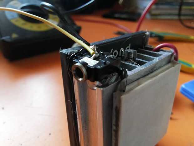 mencionado antes, batería de litio Ion tiene un circuito controlador de carga así que sólo tenemos que conectar una fuente de energía. Hacemos esto usando un cable AUX y puerto.