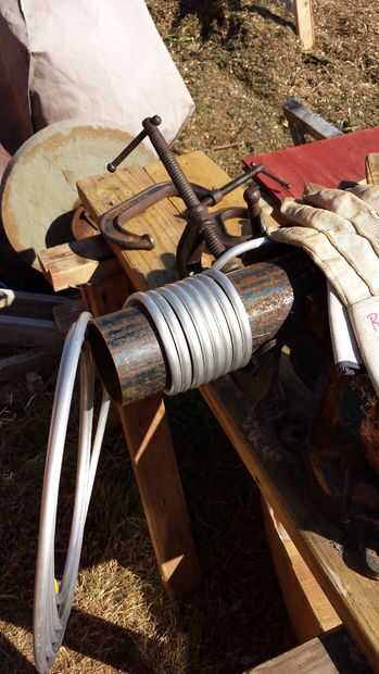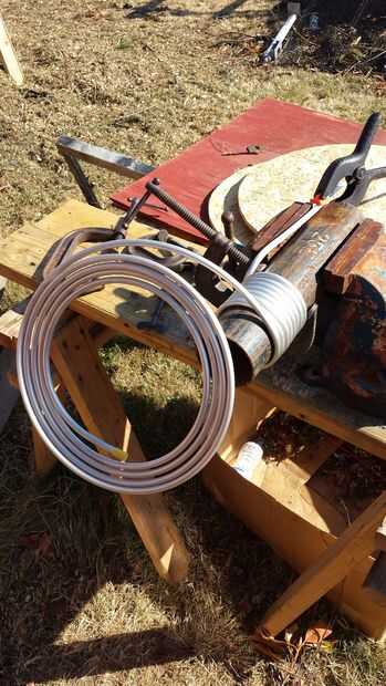 2. una abrazadera grande de 'C' como punto eje para crear la 1 º curva hacia la bobina. Encontré que tirando el tubo alrededor de la tubería, en vez de romperlo trabajó bien y no doblar o aplanar a todos. Llevó mi tiempo, mantenido la tensión en la parcela y tiró del borde de ataque hasta que había hecho lo que quería.