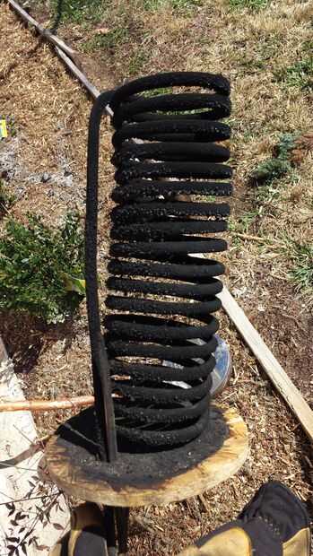 La zona negra en la clavija de madera no es carbonizada como manchas; ha pasado una cosa muy inesperada. El agua corriente por las bobinas hace que una cantidad considerable de condensación forma y goteo por la parte inferior de la Asamblea. Pensé que una vez que la chimenea se subió a la temperatura ambiente que esto cese, pero no era el caso. Por goteo el más caliente del fuego la condensación más... se trata básicamente de "humo líquido" pero no cogernos cocinar con ella, jajaja.