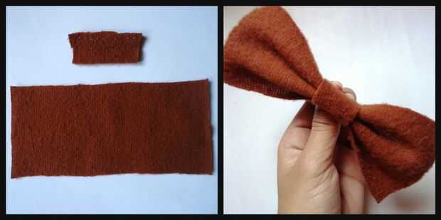 Corte un pequeño pedazo para hacer la parte media del arco. Doblar por la mitad, coser el final, doblar a la derecha hacia fuera y finalmente obtener el arco doblado a través de esa pequeña pieza para completar el arco.