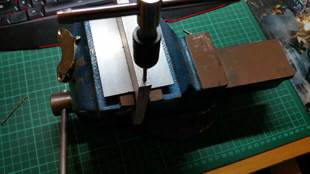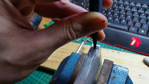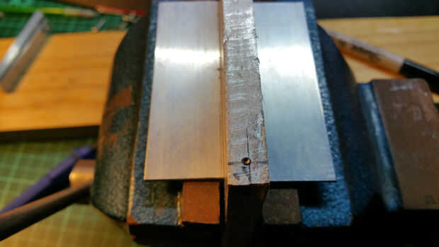 En la prensa estoy usando un ángulo de aluminio de desecho por lo que el metal no es marcado por el vicio pinzas.