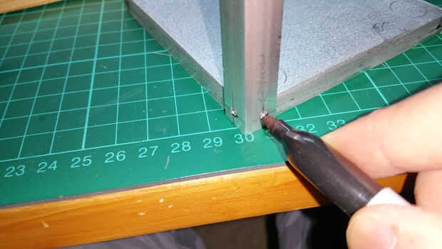 Una vez terminado el texturizado Anexe las patas y mida la distancia entre las piezas base de aluminio. Marque la ubicación en la parte inferior de la base de laminado para asegurarse de que tenía espacio para las piernas.
