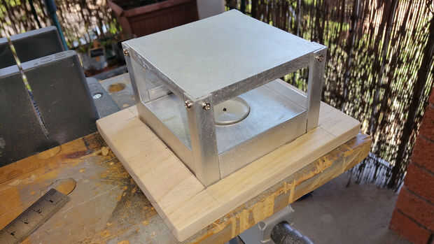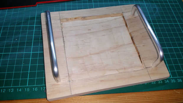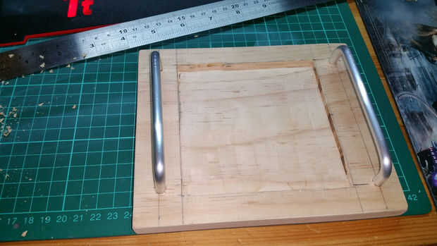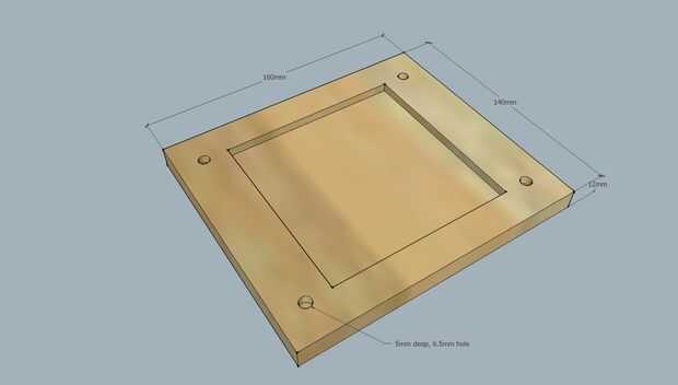 - Medir un cuadrado en el centro de la tabla de pino de marcado de 160 x 140 mm para que coincida con la base del calentador. Mina fue alrededor de 105 mm x 105 mm cuadrado.