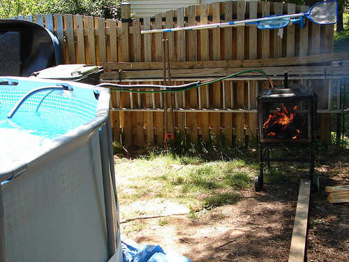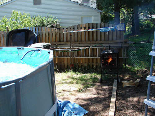 Agua de la piscina fría es bombeado desde la piscina a través de la bomba sumergible en una bobina de 50 pies de tubo de cobre montado sobre el fuego dentro del hoyo / de la parrilla. Cuando el agua hace que sea el tubo, el fuego calienta y el agua. Esto es similar a cómo funciona un calentador de agua estándar. El agua caliente sale de la tubería en la piscina.