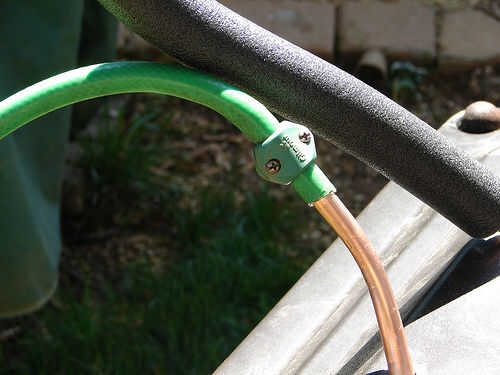 Deslice el otro extremo de la manguera de agua sobre la pieza más corta de tubo de cobre y fijarlo con la abrazadera que viene con la manguera de mujer.