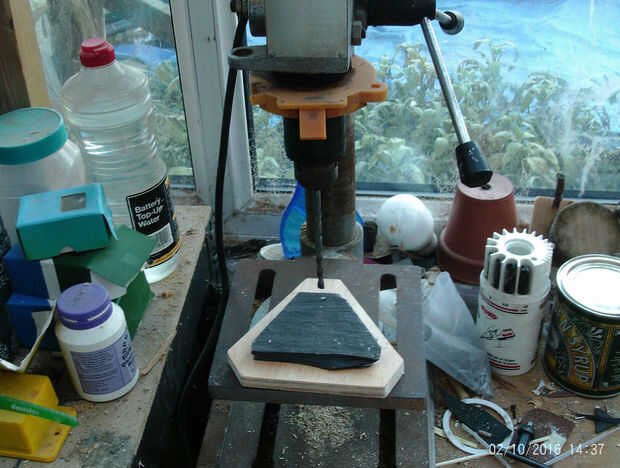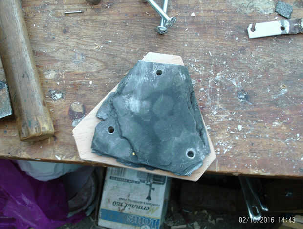 Se trata de donde salió mal, puesto que presiona demasiado con el taladro y la primera pizarra agrietado a lo largo de la media. Por suerte tenía piezas de repuesto alrededor.