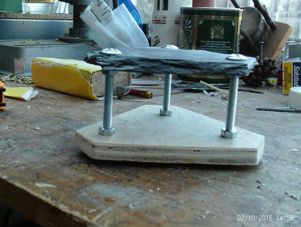 Los pernos a través de la placa base de la ranura y poner las tuercas de la parte inferior en su lugar. Ahora puede apretar las tuercas contra la parte inferior de la pizarra y la madera, usted puede poner una gota de pegamento en cada uno luego, lo hice sólo para asegurarse de que no vienen sueltos.