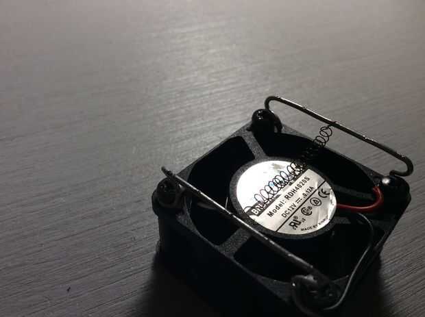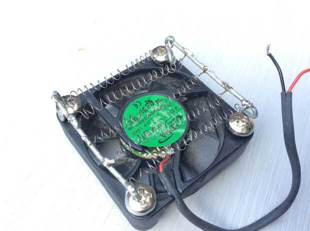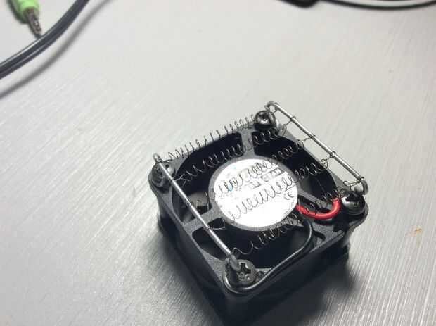 Primero necesita atornillar las piezas metálicas con los tornillos en el ventilador. Asegúrese de que están por encima del ventilador para enfriar y no calentar los tornillos y el ventilador del derretimiento. Ahora toma un resorte y gire para los dos alambres de metal, repetir este proceso para los otros tambien. Usted tendrá que soldar en su lugar para evitar que resbale alrededor pero usted no alambre de la soldadura del nicrom así que tendrás que hacer un pequeño puente de soldadura sobre el cable. Después usé un ventilador más pequeño por lo que usted vea dos los diferentes en las fotos.
